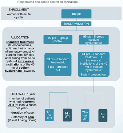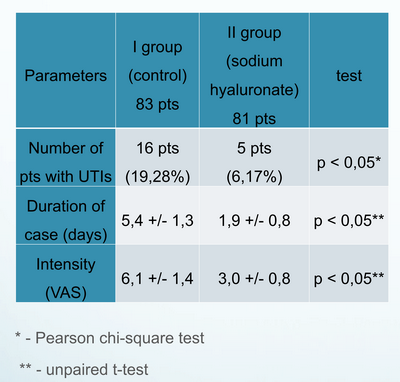 Acute cystitis is most common “female” disease in urology. More than 1 500 000 cases of acute bacterial cystitis registered in Russia every year. Usually, acute uncomplicated UTIs is easy to treat. However, 20 – 40% of patients have recurrent UTIs during year after first case of cystitis. Some studies showed that impairment of glycosaminoglycan layer lead to recurrent urogenital tract infection. Hyaluronic acid along with chondroitine sulphate and heparan sulphate is important component of protective barrier of the urothelium. We suggested that recovery of GAG-layer may prevent recurrence of bacterial cystitis after first attack of acute cystitis.