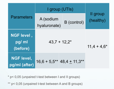 There was significant difference between 1st and 2nd group of patients. It can be associated with increased production NGF due impairment of urothelium. Also, there was significant difference between A and B subgroups. Intravesical administration of sodium hyaluronate is recovering the protective barrier of urothelium. Perhaps, it leads to decrease of NGF level.