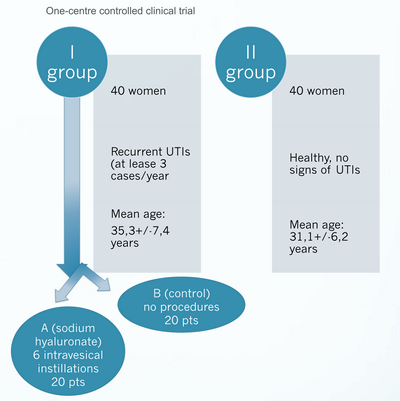 NGF level was evaluated three times in the urine of each patient before study and mean value was used in study. Urine sample was 150 ml, it was spinning and supernatant was taken for study. After that, patients of 1st group were divided into two subgroups, A and B, 20 patients in each subgroup. Thereupon, patients of A subgroup have been taken six intravesical instillations of sodium hyaluronate (160 mg in 50 ml saline) – one instillation weekly. Patients of B subgroup didn’t receive any procedures. 2 month later, NGF was evaluated repeatedly.
